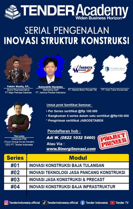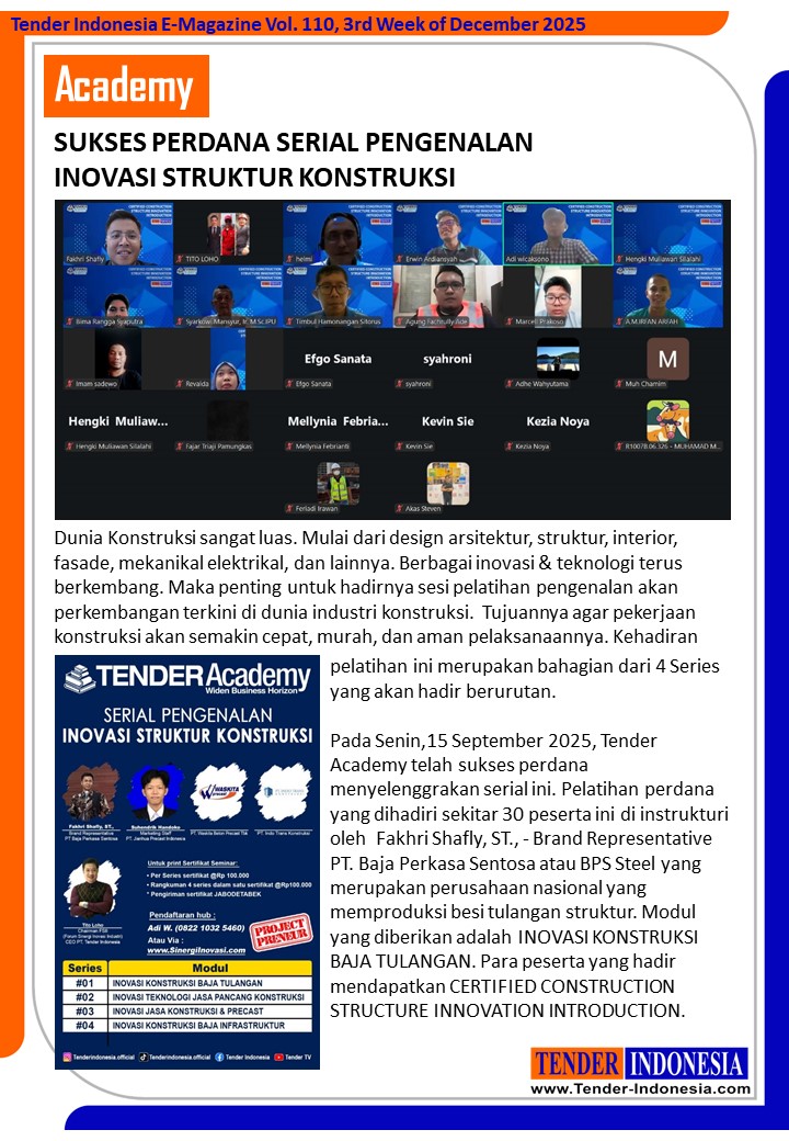 Pada Senin,15 September 2025, Tender Academy telah sukses perdana menyelenggrakan serial ini. Pelatihan perdana yang dihadiri sekitar 30 peserta ini di instrukturi oleh Fakhri Shafly, ST., - Brand Representative PT. Baja Perkasa Sentosa atau BPS Steel yang merupakan perusahaan nasional yang memproduksi besi tulangan struktur. Modul yang diberikan adalah INOVASI KONSTRUKSI BAJA TULANGAN. Para peserta yang hadir mendapatkan CERTIFIED CONSTRUCTION STRUCTURE INNOVATION INTRODUCTION.