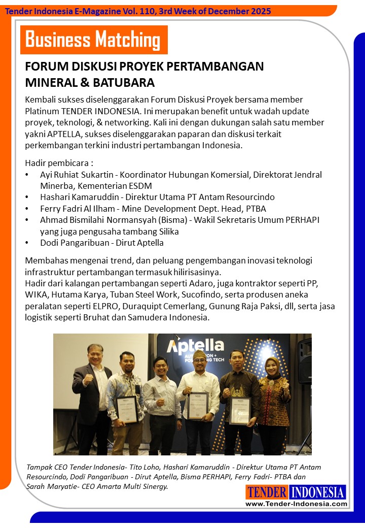 Kembali sukses diselenggarakan Forum Diskusi Proyek bersama member Platinum TENDER INDONESIA.Ini merupakan benefit untuk wadah update proyek, teknologi, & networking. Kali ini dengan dukungan salah satu member yakni APTELLA, sukses diselenggarakan paparan dan diskusi terkait perkembangan terkini industri pertambangan Indonesia.