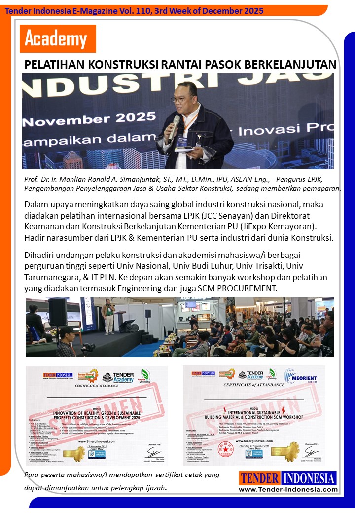Dalam upaya meningkatkan daya saing global industri konstruksi nasional, maka diadakan pelatihan internasional bersama LPJK (JCC Senayan) dan Direktorat Keamanan dan Konstruksi Berkelanjutan Kementerian PU (JiExpo Kemayoran). Hadir narasumber dari LPJK & Kementerian PU serta industri dari dunia Konstruksi.