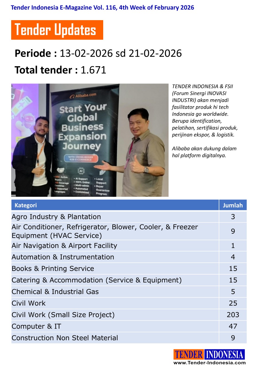 TENDER INDONESIA & FSII (Forum Sinergi INOVASI INDUSTRI) akan menjadi fasilitator produk hi tech Indonesia go worldwide. Berupa identification, pelatihan, sertifikasi produk, perijinan ekspor, & logistik.