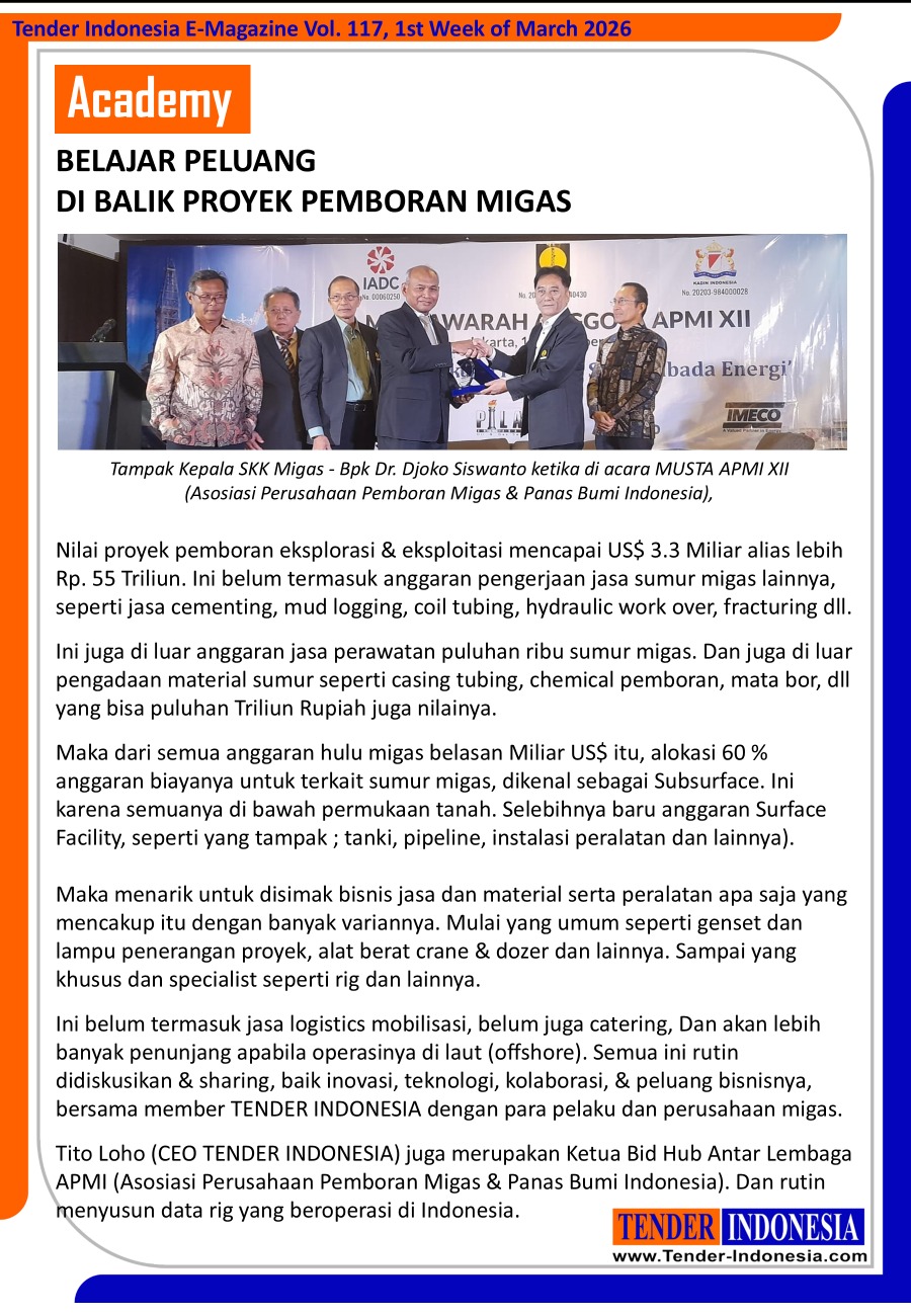 Ini belum termasuk jasa logistics mobilisasi, belum juga catering, Dan akan lebih banyak penunjang apabila operasinya di laut (offshore). Semua ini rutin didiskusikan & sharing, baik inovasi, teknologi, kolaborasi, & peluang bisnisnya, bersama member TENDER INDONESIA dengan para pelaku dan perusahaan migas.