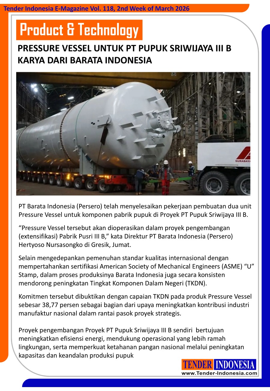PT Barata Indonesia (Persero) telah menyelesaikan pekerjaan pembuatan dua unit Pressure Vessel untuk komponen pabrik pupuk di Proyek PT Pupuk Sriwijaya III B. “Pressure Vessel tersebut akan dioperasikan dalam proyek pengembangan (extensifikasi) Pabrik Pusri III B,” kata Direktur PT Barata Indonesia (Persero) Hertyoso Nursasongko di Gresik, Jumat.