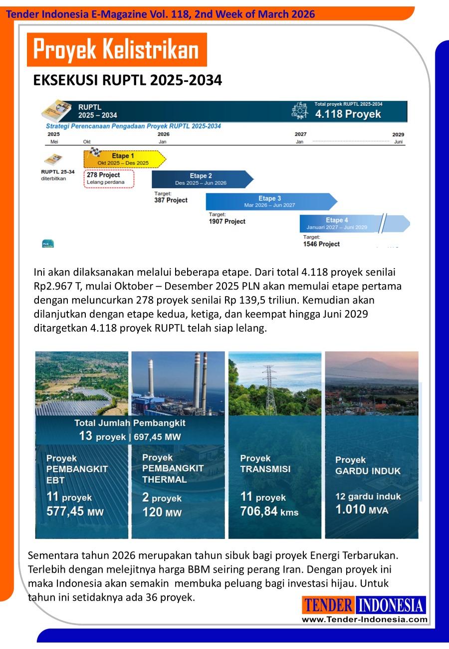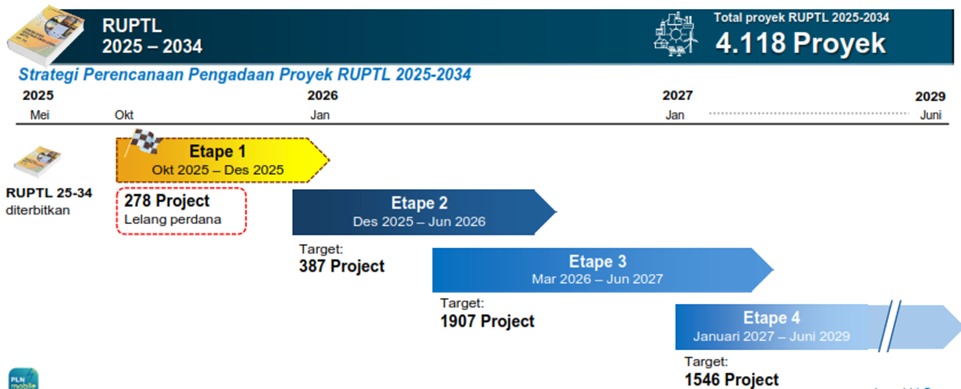 Ini akan dilaksanakan melalui beberapa etape. Dari total 4.118 proyek senilai Rp2.967 T, mulai Oktober – Desember 2025 PLN akan memulai etape pertama dengan meluncurkan 278 proyek senilai Rp 139,5 triliun. Kemudian akan dilanjutkan dengan etape kedua, ketiga, dan keempat hingga Juni 2029 ditargetkan 4.118 proyek RUPTL telah siap lelang.