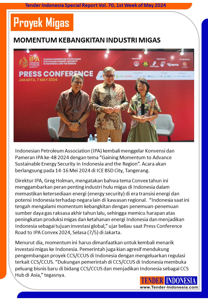 Indonesian Petroleum Association (IPA) kembali menggelar Konvensi dan Pameran IPA ke-48 2024 dengan tema “Gaining Momentum to Advance Sustainable Energy Security in Indonesia and the Region”. Acara akan berlangsung pada 14-16 Mei 2024 di ICE BSD City, Tangerang.
