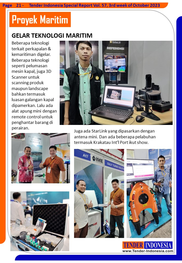 Beberapa teknologi terkait perkapalan & kemaritiman digelar. Beberapa teknologi seperti pelumasan mesin kapal, juga 3D Scanner untuk scanning produk maupun landscape bahkan termasuk luasan galangan kapal dipamerkan. Lalu ada alat apung mini dengan remote control untuk penghantar barang di perairan. Juga ada StarLink yang dipasarkan dengan antena mini. Dan ada beberapa pelabuhan termasuk Krakatau Int'l Port ikut show.