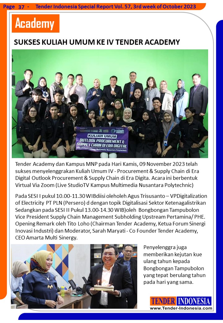 Tender Academy dan Kampus MNP pada Hari Kamis, 09 November 2023 telah sukses menyelenggrakan Kuliah Umum IV - Procurement & Supply Chain di Era Digital Outlook Procurement & Supply Chain di Era Digita. Acara ini berbentuk Virtual Via Zoom (Live StudioTV Kampus Multimedia Nusantara Polytechnic)