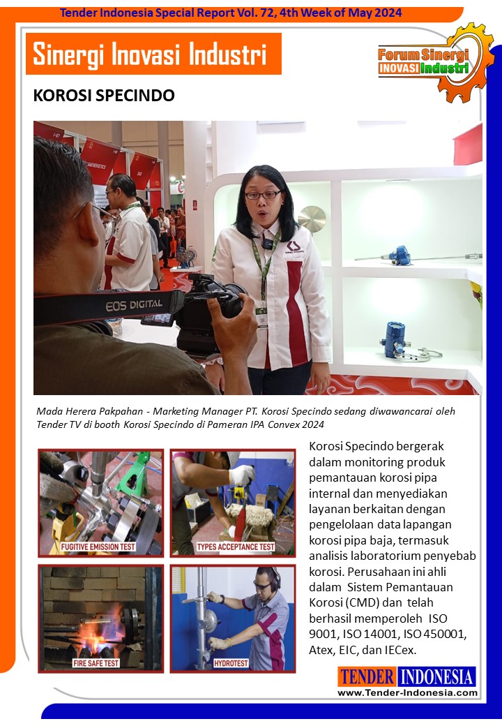Korosi Specindo bergerak dalam monitoring produk pemantauan korosi pipa internal dan menyediakan layanan berkaitan dengan pengelolaan data lapangan korosi pipa baja, termasuk analisis laboratorium penyebab korosi. Perusahaan ini ahli dalam Sistem Pemantauan Korosi (CMD) dan telah berhasil memperoleh ISO 9001, ISO 14001, ISO 450001, Atex, EIC, dan IECex.