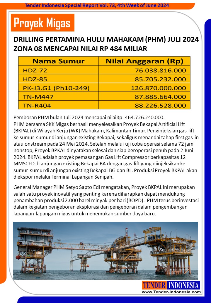 Pemboran PHM bulan Juli 2024 mencapai nilaiRp 464.726.240.000. PHM bersama SKK Migas berhasil menyelesaikan Proyek Bekapai Artificial Lift (BKPAL) di Wilayah Kerja (WK) Mahakam, Kalimantan Timur. Penginjeksian gas-lift ke sumur-sumur di anjungan existing Bekapai, sekaligus menandai tahap first gas-in atau onstream pada 24 Mei 2024. Setelah melalui uji coba operasi selama 72 jam nonstop, Proyek BPKAL dinyatakan selesai dan siap beroperasi penuh pada 2 Juni 2024. BKPAL adalah proyek pemasangan Gas Lift Compressor berkapasitas 12 MMSCFD di anjungan existing Bekapai BA dengan gas-lift yang diinjeksikan ke sumur-sumur di anjungan existing Bekapai BG dan BL. Produksi Proyek BKPAL akan diekspor melalui Terminal Lapangan Senipah.