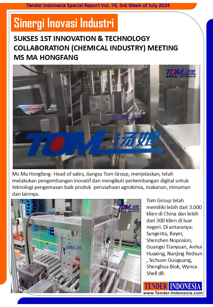 Ms Ma Hongfang- Head of sales, Jiangsu Tom Group, menjelaskan, telah melakukan pengembangan inovatif dan mengikuti perkembangan digital untuk teknologi pengemasan baik produk perusahaan agrokimia, makanan, minuman dan lainnya.