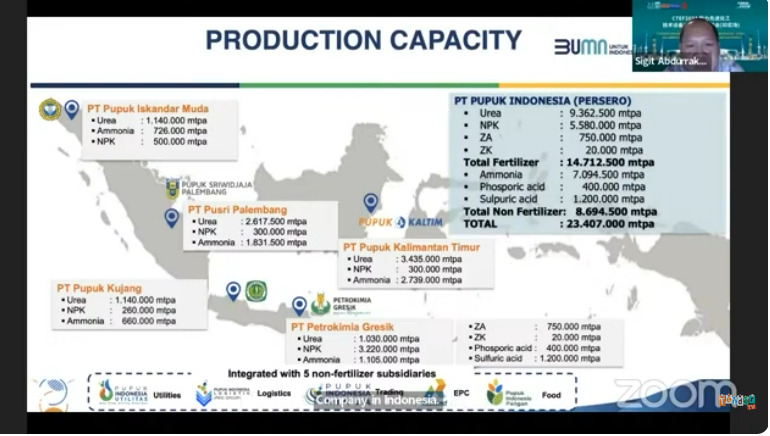 Sigit Abdurrakhman - VP Production Planning & Control, PT Pupuk Indonesia (Persero), menjelaskan kapasitas produksi PT Pupuk Indonesia pada 2024 mencapai 14 juta ton. Total semuai itu berasal dari produksi urea sekitar 9,3 juta ton, NPK sebesar 5,5 juta ton, ZA sebesar 750 ribu ton dan ZK sebesar 20 ribu ton.
