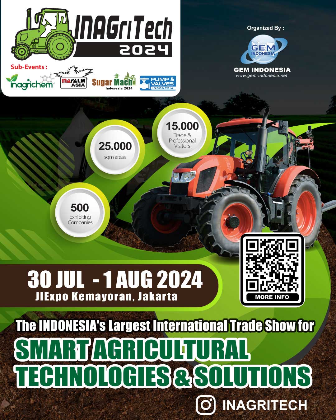 INAGRITECH dikenal sebagai pameran perdagangan mesin dan teknologi pertanian dalam dan luar ruangan terbesar di bidangnya di Indonesia. Pameran ini mempunyai peran penting dalam industri agro-ekonomi yang menyajikan tren-tren baru dan mengumpulkan pemasok global serta menjadi tempat pertemuan utama bagi para peserta pameran untuk berjejaring.