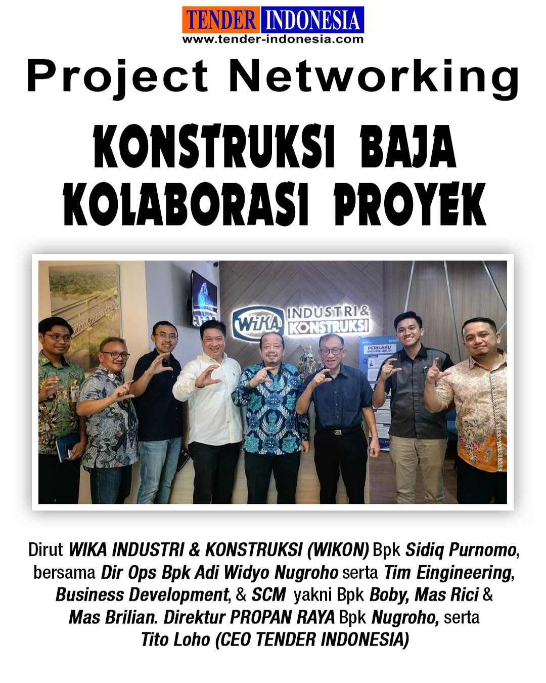 Tampak foto : Dirut WIKA INDUSTRI & KONSTRUKSI (WIKON) Bpk Sidiq Purnomo bersama Dir Ops Bpk Adi Widyo Nugroho serta Tim Eingineering, Business Development, & SCM yakni Bpk Boby, Mas Rici, & Mas Brilian. Direktur PROPAN RAYA Bpk Nugroho Tito Loho CEO TENDER INDONESIA
