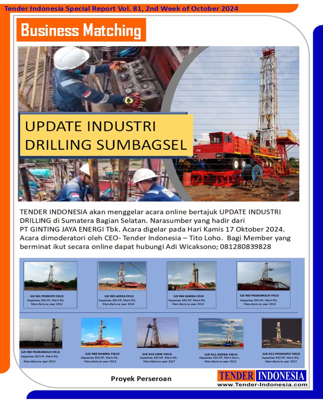 TENDER INDONESIA akan menggelar acara online bertajuk UPDATE INDUSTRI DRILLING di Sumatera Bagian Selatan.